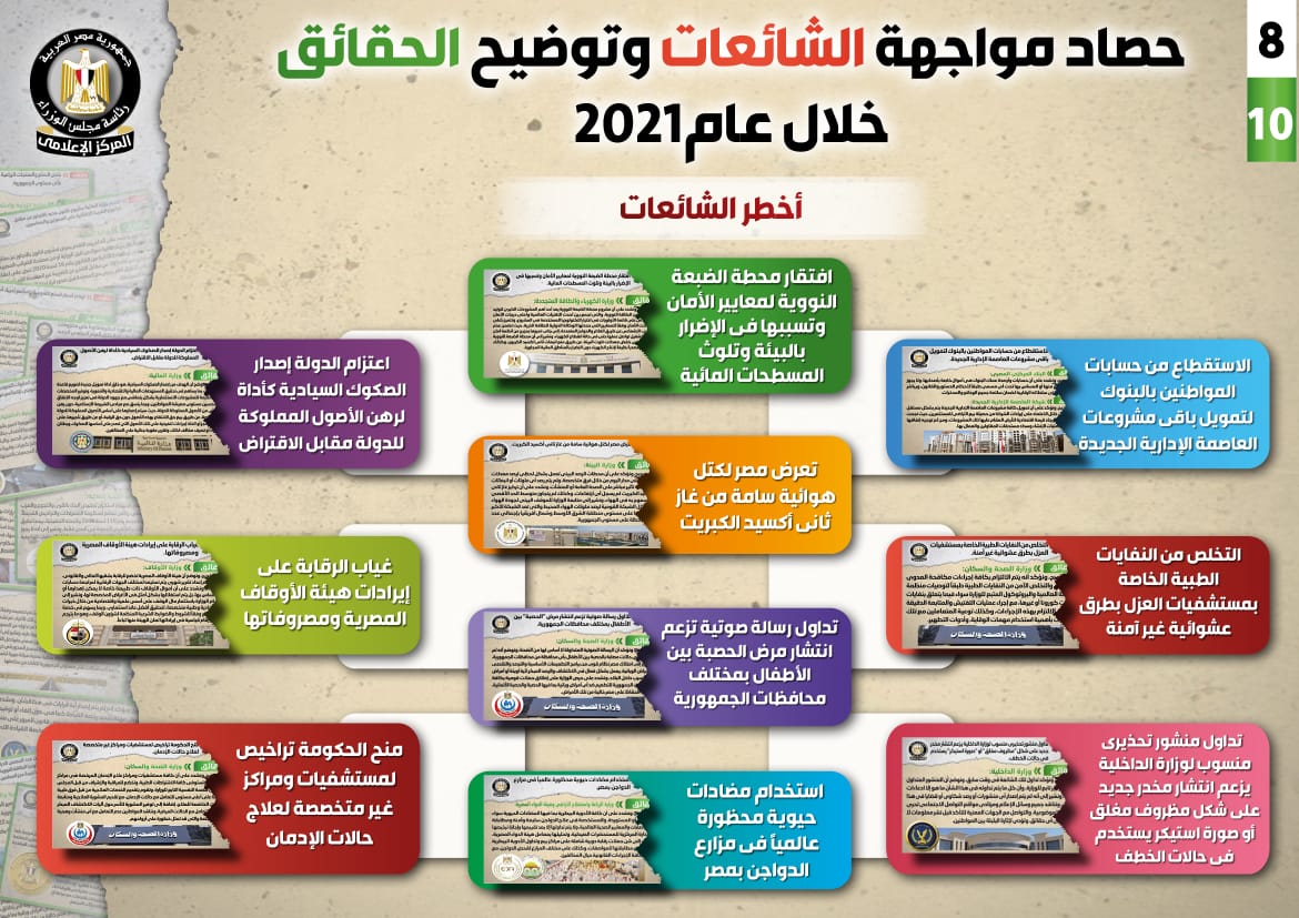 كما تضمنت أخطر الشائعات خلال 2021 منح الحكومة تراخيص لمستشفيات ومراكز غير متخصصة لعلاج حالات الإدمان، وافتقار محطة الضبعة النووية لمعايير الأمان وتسببها في الإضرار بالبيئة وتلوث المسطحات المائية.