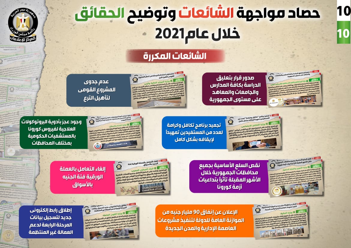 أما بالنسبة للشائعات التي تكررت وتم نفيها أكثر من مرة، فقد أشار التقرير إلى شائعة صدور قرار بتعليق الدراسة بكافة المدارس والجامعات والمعاهد على مستوى الجمهورية، وعدم جدوى المشروع القومي لتأهيل الترع، ووجود عجز بأدوية البروتوكولات العلاجية لفيروس كورونا بالمستشفيات الحكومية بمختلف المحافظات، وتجميد برنامج "تكافل وكرامة" لعدد من المستفيدين تمهيدًا لإيقافه بشكل كامل.