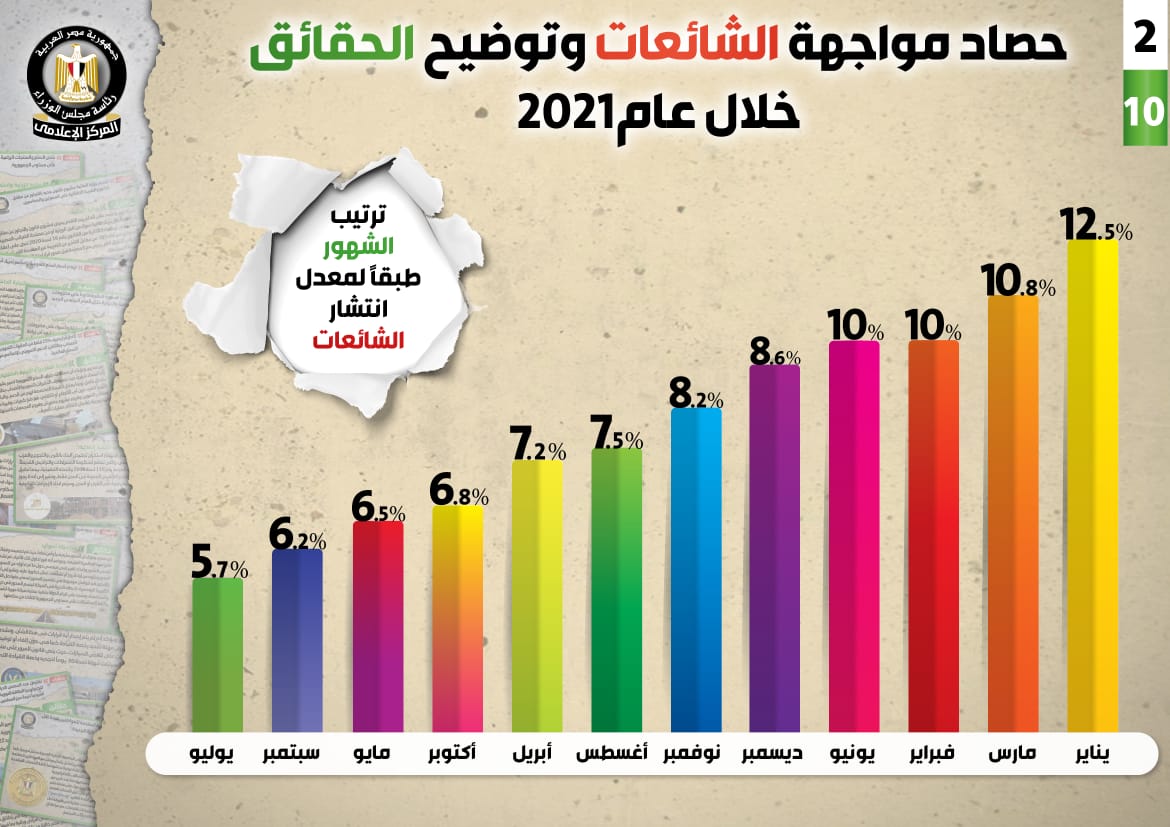 وأشار التقرير إلى ترتيب الشهور طبقًا لمعدل انتشار الشائعات على مدار عام 2021، حيث جاء شهر يناير في المركز الأول بنسبة 12.5%، تلاه شهر مارس بنسبة 10.8%، ثم كل من فبراير ويونيو بنسبة 10%، وديسمبر 8.6%، ونوفمبر 8.2%، وأغسطس 7.5%، وأبريل 7.2%، وأكتوبر 6.8%، ومايو 6.5%، وسبتمبر 6.2%، ويوليو 5.7%.