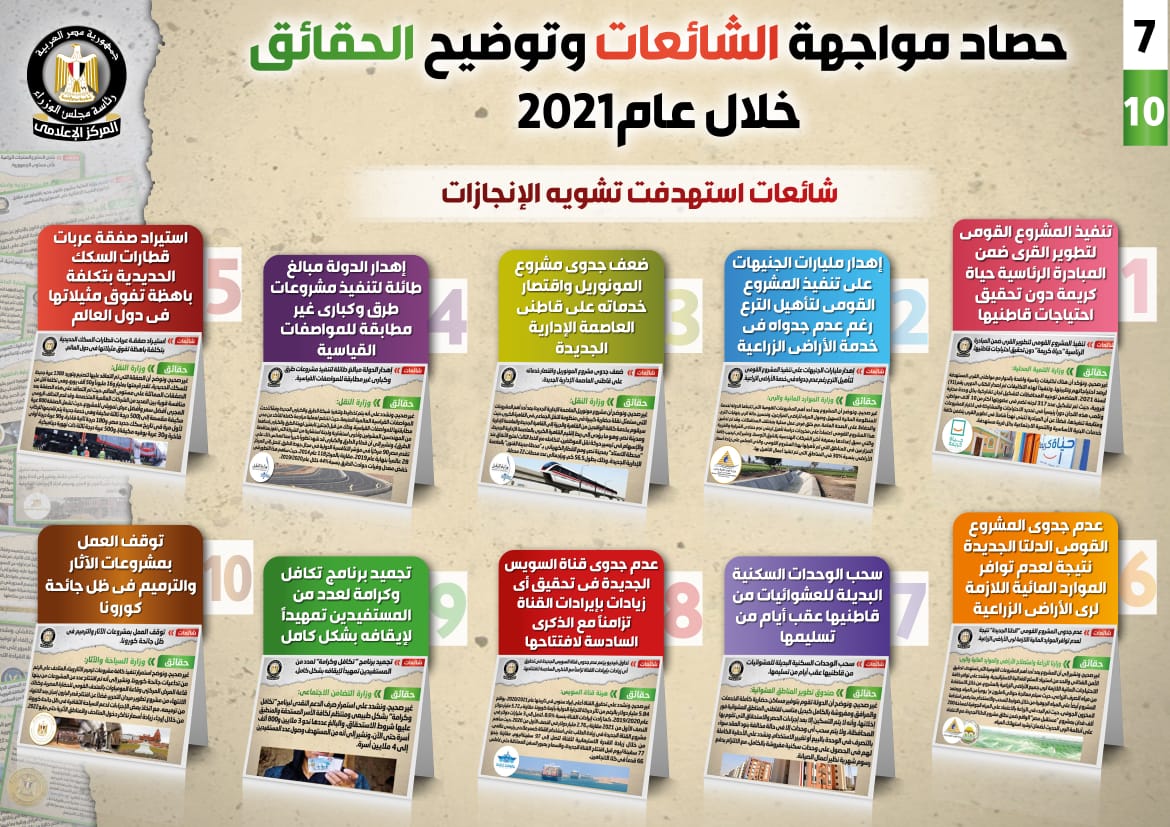 وأورد التقرير الشائعات التي استهدفت تشويه الإنجازات، وهي ضعف جدوى مشروع المونوريل واقتصار خدماته على قاطني العاصمة الإدارية الجديدة، وعدم جدوى المشروع القومي "الدلتا الجديدة" نتيجة لعدم توافر الموارد المائية اللازمة لري الأراضي الزراعية، وتنفيذ المشروع القومي لتطوير القرى ضمن المبادرة الرئاسية "حياة كريمة" دون تحقيق احتياجات قاطنيها.