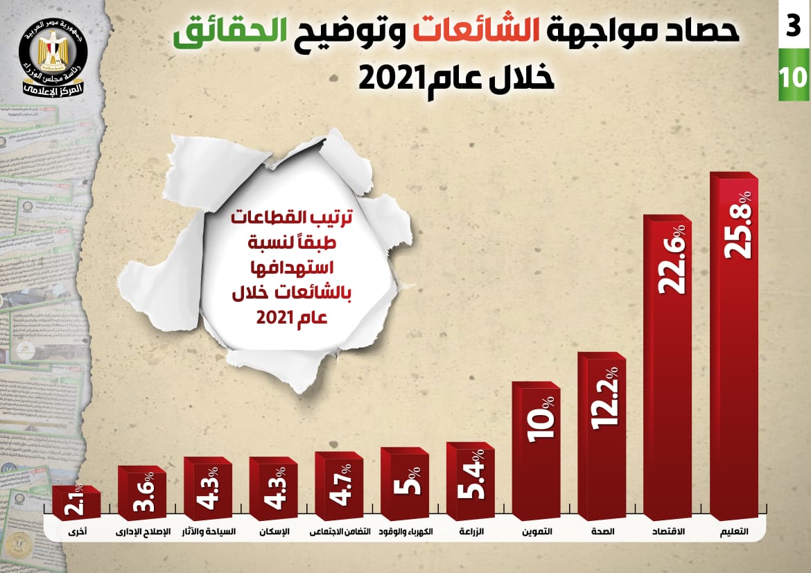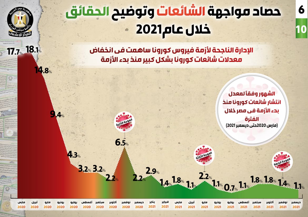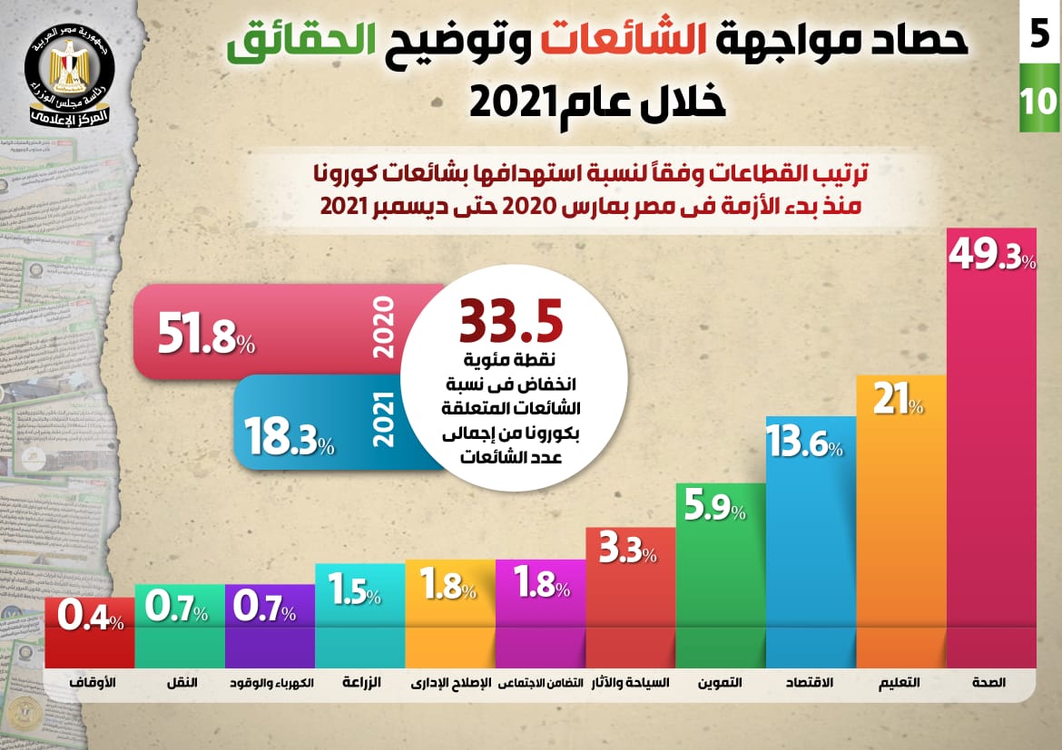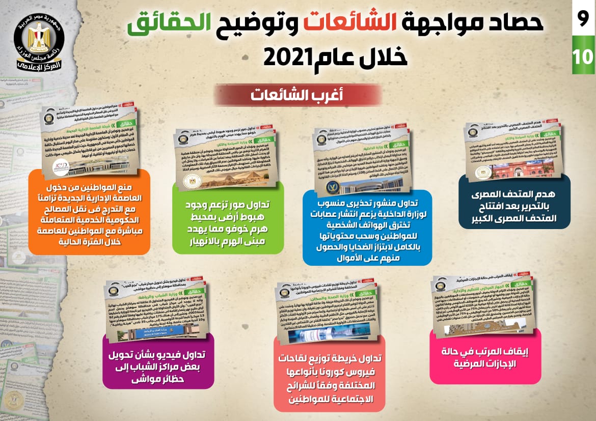 نشر المركز الإعلامي لمجلس الوزراء تقريرًا تضمن إنفوجرافات تسلط الضوء على حصاد مواجهة الشائعات وتوضيح الحقائق خلال عام 2021.