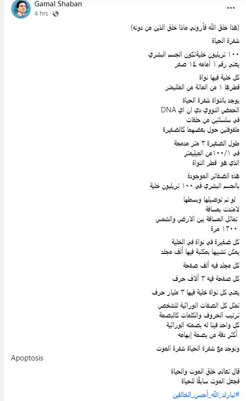 وكتب الدكتور جمال شعبان تدوينة على الفيس بك (هذا خلق الله فأروني ماذا خلق الذين من دونه).. شفرة الحياة.. ١٠٠ تريليون خلية تكون الجسم البشري، يعني رقم ١ أمامه ١٤ صفر، كل خلية فيها نواة قطرها ١ من المائة من الملليمتر"