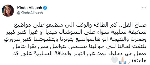 وكتبت كندة علوش تغريدة على تويتر: "صباح الفل.. كم الطاقة والوقت اللي ينضيعه على مواضيع سخيفة سلبية سواء على السوشال ميديا او غيرها كتير كبير ومحزن والنتيجة انه هالمواضيع بتوترنا وبتشوشنا كتير ضروري نلتفت لحالنا للي حوالينا نسمعن نتواصل معن نقرا نتأمل نعمل خير نحاول نبعد عن التوتر والطاقة السلبية على قد ما منقدر".