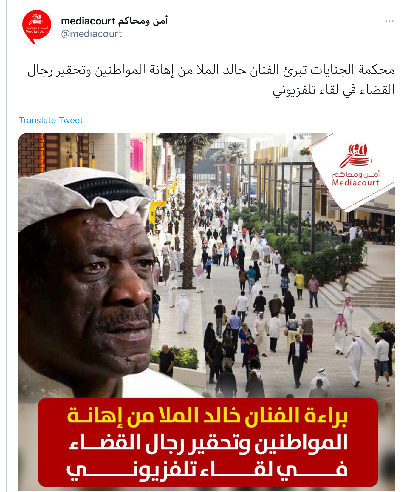 ووفق حساب ”أمن ومحاكم“ الكويتي عبر ”تويتر“، فإن ”محكمة الجنايات برّأت الفنان خالد الملا من إهانة المواطنين وتحقير رجال القضاء في لقاء تلفزيوني“.