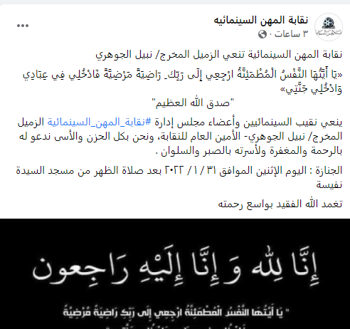 وقالت النقابة، في بيان لها: ينعي نقيب السينمائيين وأعضاء مجلس إدارة نقابة المهن السينمائية الزميل المخرج نبيل الجوهري - الأمين العام للنقابة، ونحن بكل الحزن والأسى ندعو له بالرحمة والمغفرة ولأسرته بالصبر والسلوان.