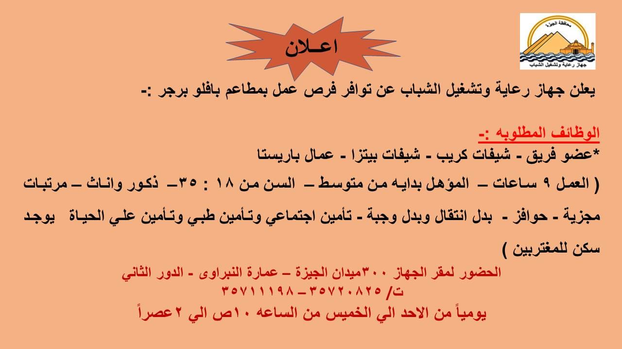 أعلن جهاز رعاية وتشغيل الشباب بمحافظة الجيزة عن توافر فرص عمل بمطاعم بافلو برج:_