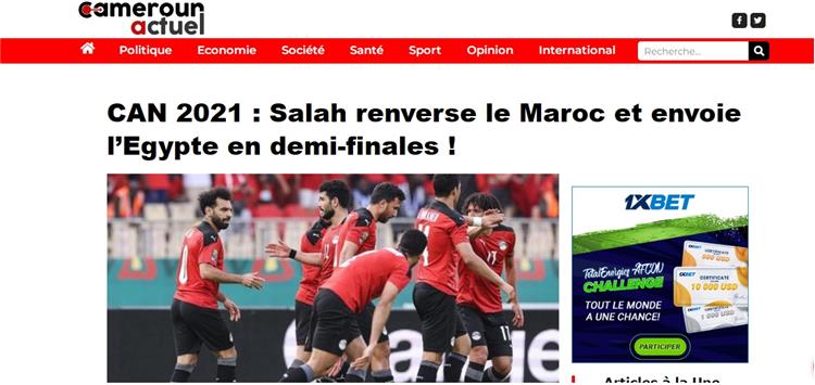اهتمت الصحف والمواقع الكاميرونية، بفوز منتخب مصر على المغرب 2/1 ومواجهة منتخب الكاميرون في الدور نصف النهائي لبطولة كأس أمم أفريقيا.