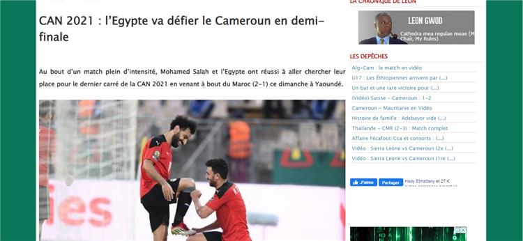 فيما عنونت شبكة كاميرون ويب.. "مصر المنافس القادم للكاميرون في نصف نهائي كأس الأمم الإفريقية 2021".