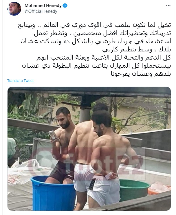 وكتب محمد هنيدي تغريدة على تويتر "تخيل لما تكون بتلعب في اقوى دوري في العالم.. وبيتابع تدريباتك وتحضيراتك افضل متخصصين. وتضطر تعمل استشفاء في جردل طرشي بالشكل ده وتسكت عشان بلدك. وسط تنظيم كارثي"