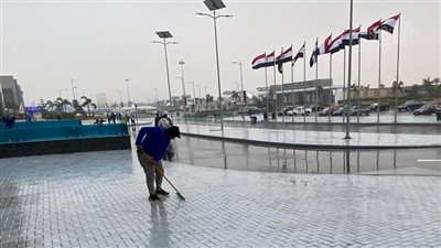 وحرص عمال معرض القاهرة الدولي للكتاب على تأدية مهامهم في إزاحة تجمعات المياه من أمام القاعات، منذ صباح اليوم، لتهيئة مداخل القاعات لجمهور وزوار المعرض في خامس أيامه.