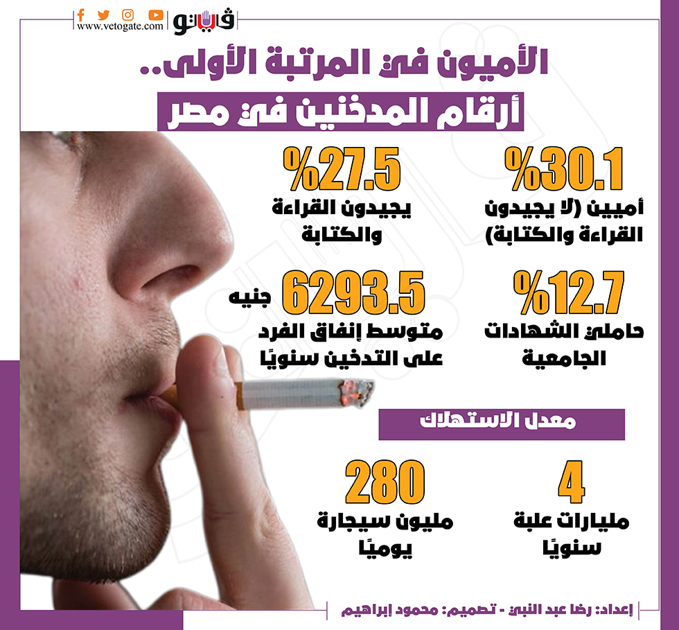 الأميون في المرتبة الأولى.. أرقام المدخنين في مصر | إنفوجراف الإثنين 31/يناير/2022 - 07:12 م 1/31/2022 7:12:51 PM رضا عبدالنبى شارك طباعة 18 حجم الخط شارك طباعة