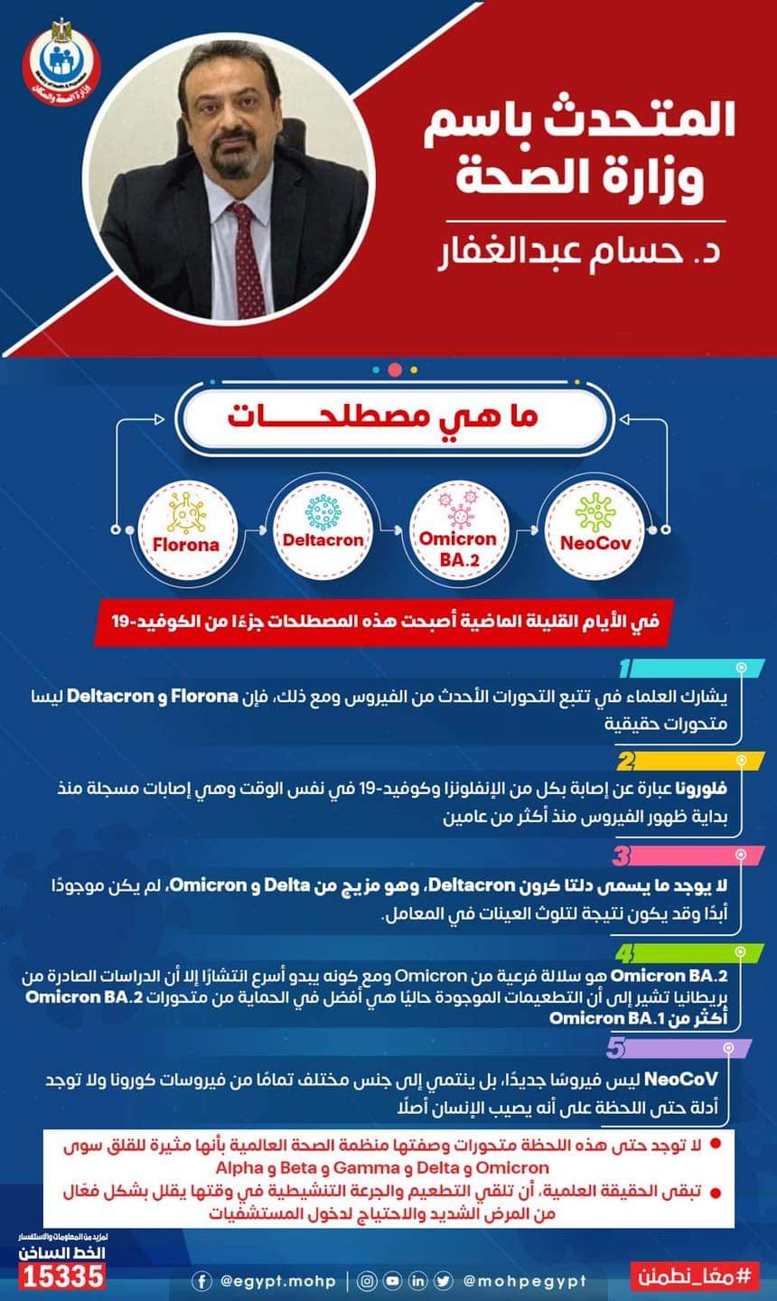 أكد الدكتور حسام عبد الغفار المتحدث الرسمي لوزارة الصحة، أن neocov نيوكوف ليس فيروسًا جديدًا بل هو ينتمي إلى جنس مختلف تمامًا من فيروسات كورونا ولا يوجد أي أدلة علمية تثبت أنه ينتقل للإنسان أو يصيبه.