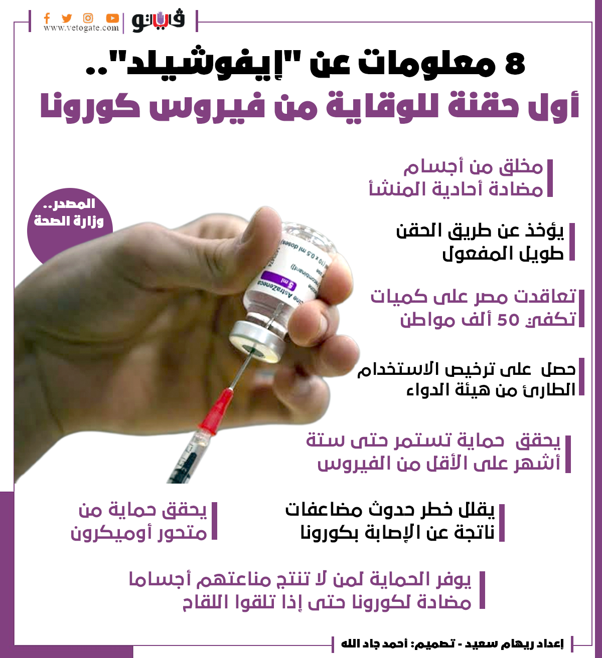 8 معلومات عن "إيفوشيلد"..أول حقنة للوقاية من فيروس كورونا| إنفوجراف الثلاثاء 01/فبراير/2022 - 06:39 م 2/1/2022 6:39:14 PM ايفوشيلد ريهام سعيد شارك طباعة 18 حجم الخط شارك طباعة الدواء المصري سرطان الدم وزارة الصحة فيروس كورونا الوقاية من فيروس كورونا الهيئة المصرية للشراء الموحد كورونا في مصر هيئة الدواء المصرية المضاد لفيروس كورونا إصابة بفيروس كورونا متحور أوميكرون