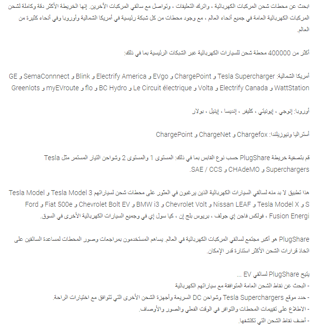 ويضم التطبيق بيانات ومعلومات عن أكثر من 400000 محطة شحن للسيارات الكهربائية عبر الشبكات الرئيسية بما في ذلك: