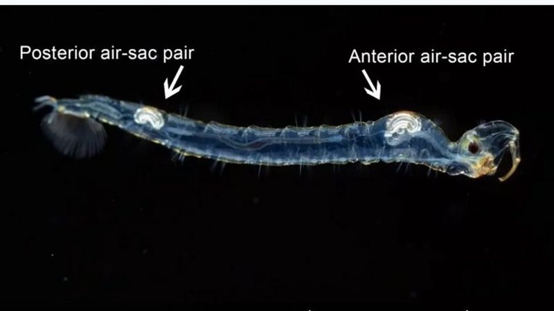 إذن كيف تتم عملية دخول الأكسجين إلى الأكياس الهوائية، لتحقيق طفو محايد؟بدافع المغامرة، أخذ ماثيوز بعض اليرقات إلى المختبر ووضعها تحت المجهر، عندما قام بتشغيل الضوء فوق البنفسجي، لاحظ أن الأكياس الهوائية تبدأ في التوهج باللون الأزرق الساطع.