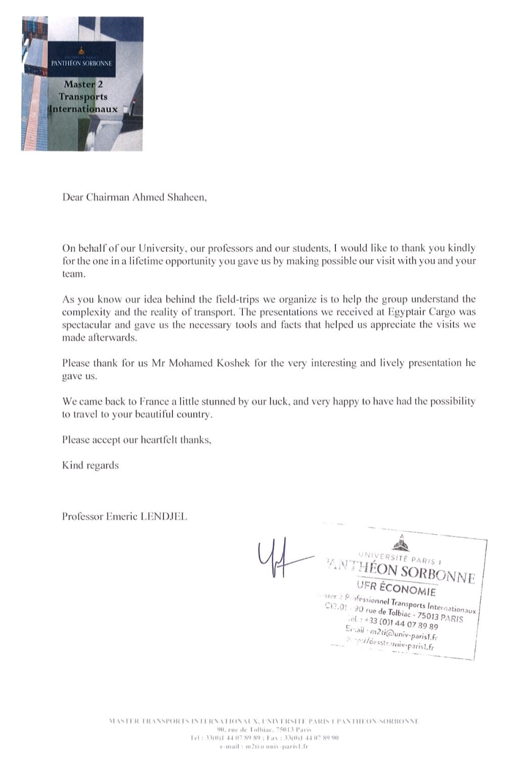 وكان وفد جامعة السوربون بباريس قد قام بزيارة ميدانية لمقر شركة مصر للطيران وكذلك مجمع البضائع بمطار القاهرة للتعرف على نشاط شركة مصر للطيران للشحن الجوي ضمن رسالة ماجستير يعدها الطلبة بعنوان " لوجستيات النقل الدولي دراسة حالة لنشاط الشحن بجمهورية مصر العربية ".