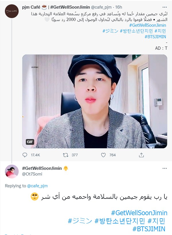 فقال Pjm cafe " لنُري جيمين مقدار حُبنا له ونُساعد في رفع مركزهِ بسُمعة العلامة التِجارية هذا الشهر • فضلًا قوموا بالرد بالتالي لنُحاول الوصول إلى 2000 رد سويًا"