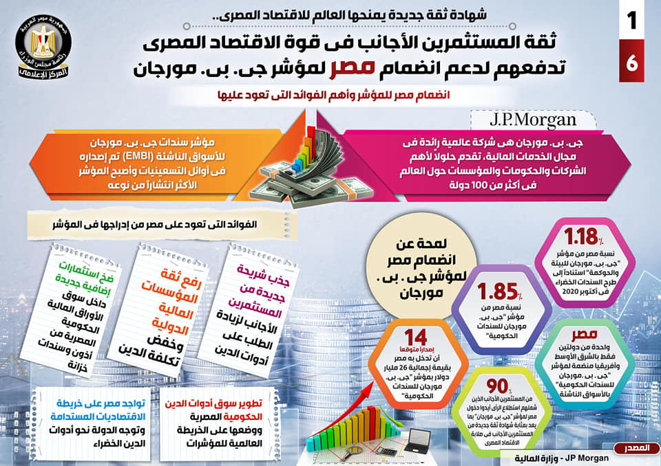 وفي هذا الصدد نشر المركز الإعلامي لمجلس الوزراء تقريرًا تضمن إنفوجرافات تسلط الضوء على انضمام مصر لمؤشر جي بي مورجان بدعم من ثقة المستثمرين الأجانب في قوة الاقتصاد المصري، وهو ما يعد بمثابة شهادة ثقة جديدة من العالم.