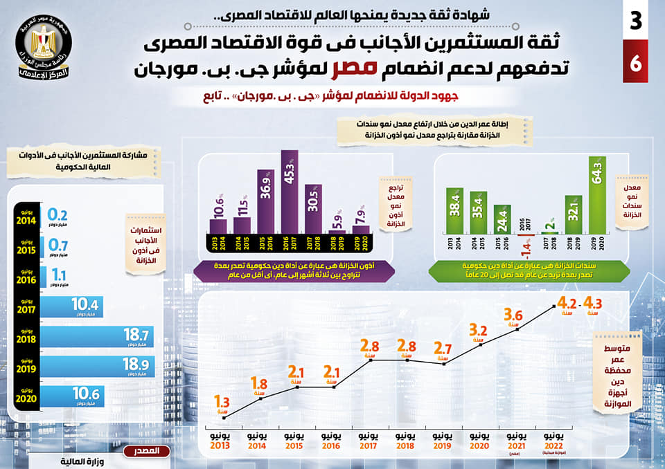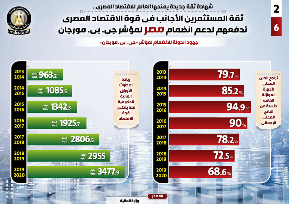 وإلى جانب ما سبق، تضمنت جهود الدولة للانضمام لمؤشر "جي. بي. مورجان" مشاركة المستثمرين الأجانب في الأدوات المالية الحكومية، لتبلغ استثماراتهم في أذون الخزانة 10.6 مليار دولار في يونيو 2020 مقارنة بـ 18.9 مليار دولار في يونيو 2019 و18.7 مليار دولار في يونيو 2018، و10.4 مليار دولار في يونيو 2017، و1.1 مليار دولار في يونيو 2016، و0.7 مليار دولار في يونيو 2015، و0.2 مليار دولار في يونيو 2014.
