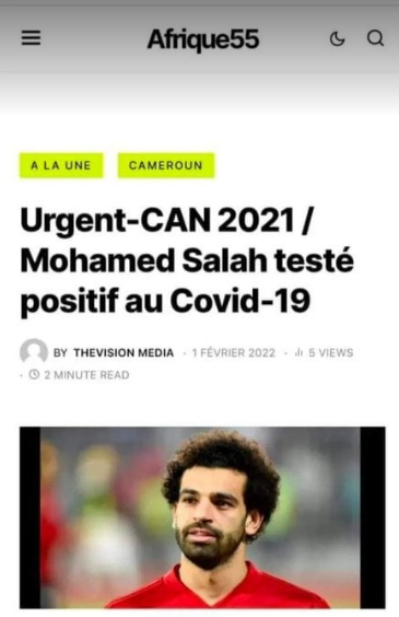 وذكرت صحيفة “afrique55” أن محمد صلاح قد لا يشارك مع منتخب مصر أمام الكاميرون، حيث جاءت نتيجة مسحته “إيجابية” قبل خوض اللقاء المرتقب.