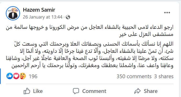 فيما طالب سمير متابعيه منذ أيام بالدعاء لوالدته حيث كتب على فيس بوك:"ارجو الدعاء لامى الحبيبة بالشفاء العاجل من مرض الكورونا وخروجها سالمة من مستشفى العزل على خير..اللهم إنا نسألك بأسمائك الحسنى وبصفاتك العلا وبرحمتك التي وسعت كلّ شئ، أن تمنّ علينا بالشفاء العاجل، وألّا تدع فينا جرحًا إلّا داويته، ولا ألمًا إلا سكنته، ولا مرضًا إلا شفيته، وألبسنا ثوب الصحة والعافية عاجلًا غير آجل، وشافِنا وعافِنا واعف عنا، واشملنا بعطفك ومغفرتك، وتولّنا برحمتك يا أرحم الراحمين".