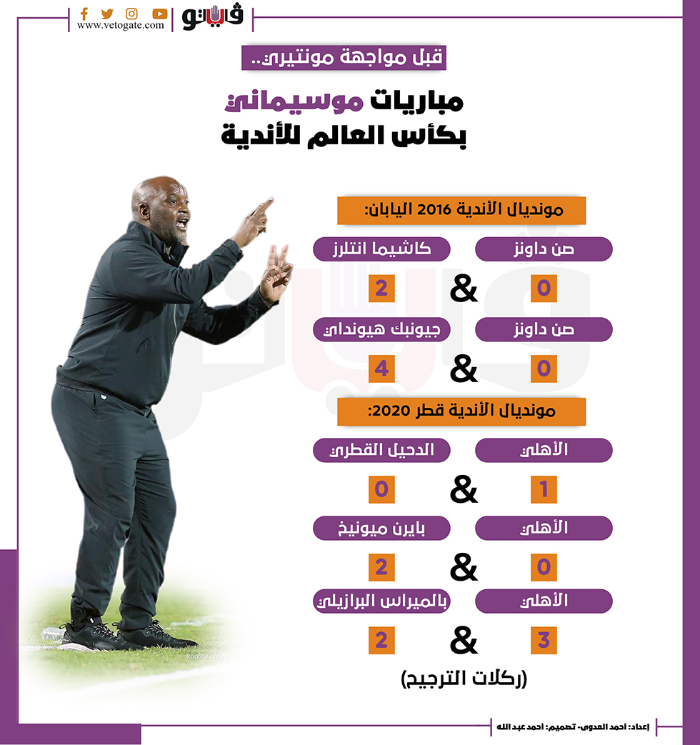 قبل مواجهة مونتيري.. مباريات موسيماني بكأس العالم للأندية| إنفوجراف الأربعاء 02/فبراير/2022 - 08:50 م 2/2/2022 8:50:52 PM مباريات موسيماني بكأس العالم للأندية أحمد العدوي شارك طباعة 18 حجم الخط شارك طباعة موسيماني كأس العالم للأندية اخبار الرياضة اخبار الأهلي الأهلي الاهلي اليوم
