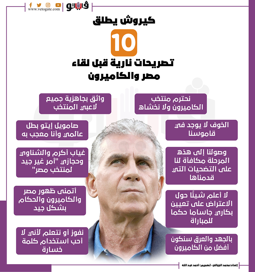 كيروش يطلق 10 تصريحات نارية قبل لقاء مصر والكاميرون | إنفوجراف الأربعاء 02/فبراير/2022 - 09:54 م 2/2/2022 9:54:46 PM كيروش يطلق 10 تصريحات نارية قبل لقاء مصر والكاميرون إعداد محمد الجبالي شارك طباعة 18 حجم الخط شارك طباعة كارلوس كيروش منتخب مصر المغرب الكميرون مصر