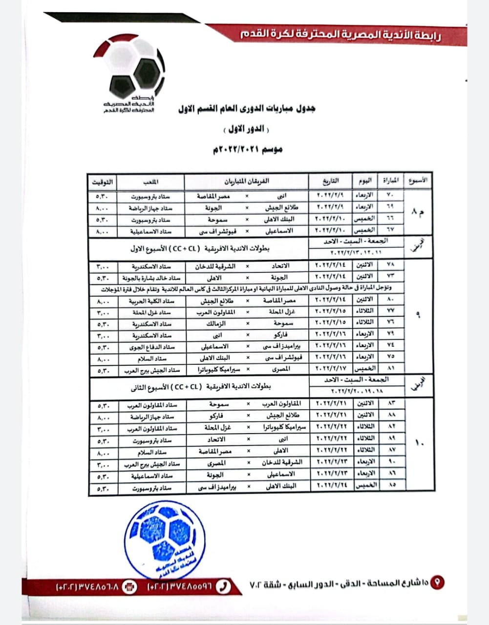 وجاءت مواعيد المباريات المتبقية فى الدور الأول بمسابقة الدوري الممتاز كما هو موضح بالجدول الآتي: