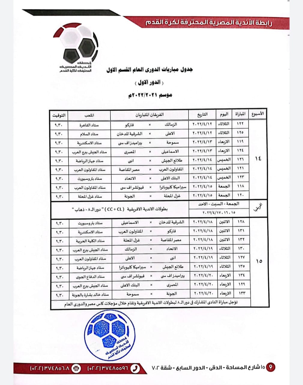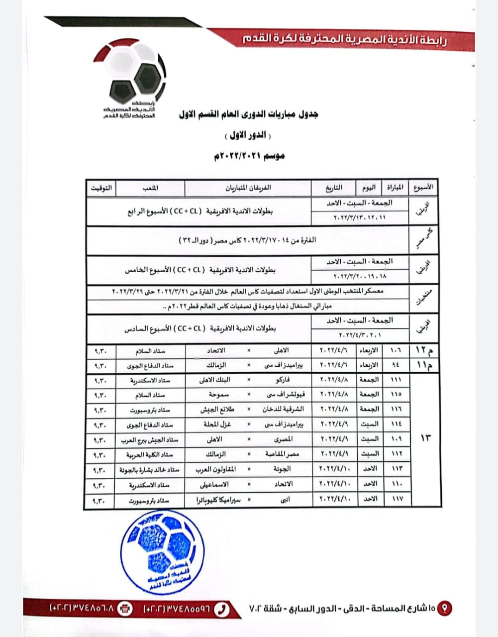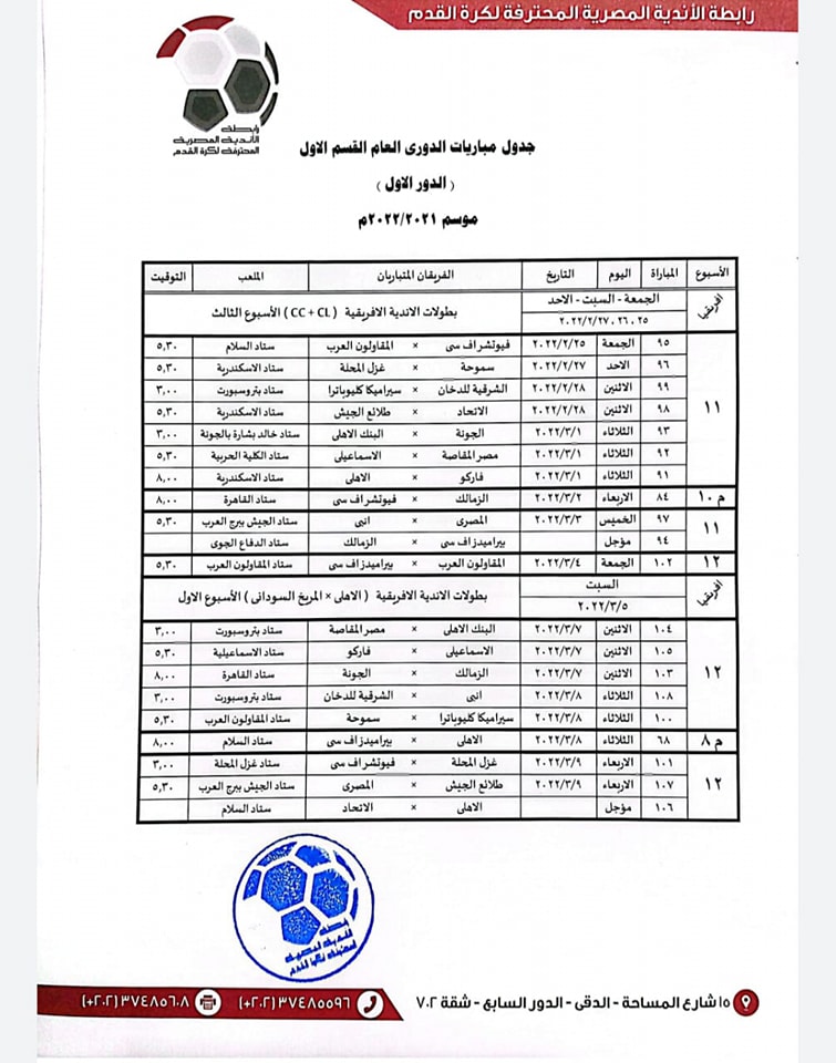 أعلنت لجنة المسابقات التابعة لرابطة الأندية المحترفة، أمس الأربعاء، جدول المباريات المتبقية من الدور الأول ببطولة الدوري الممتاز للموسم الحالي 2021-2022.