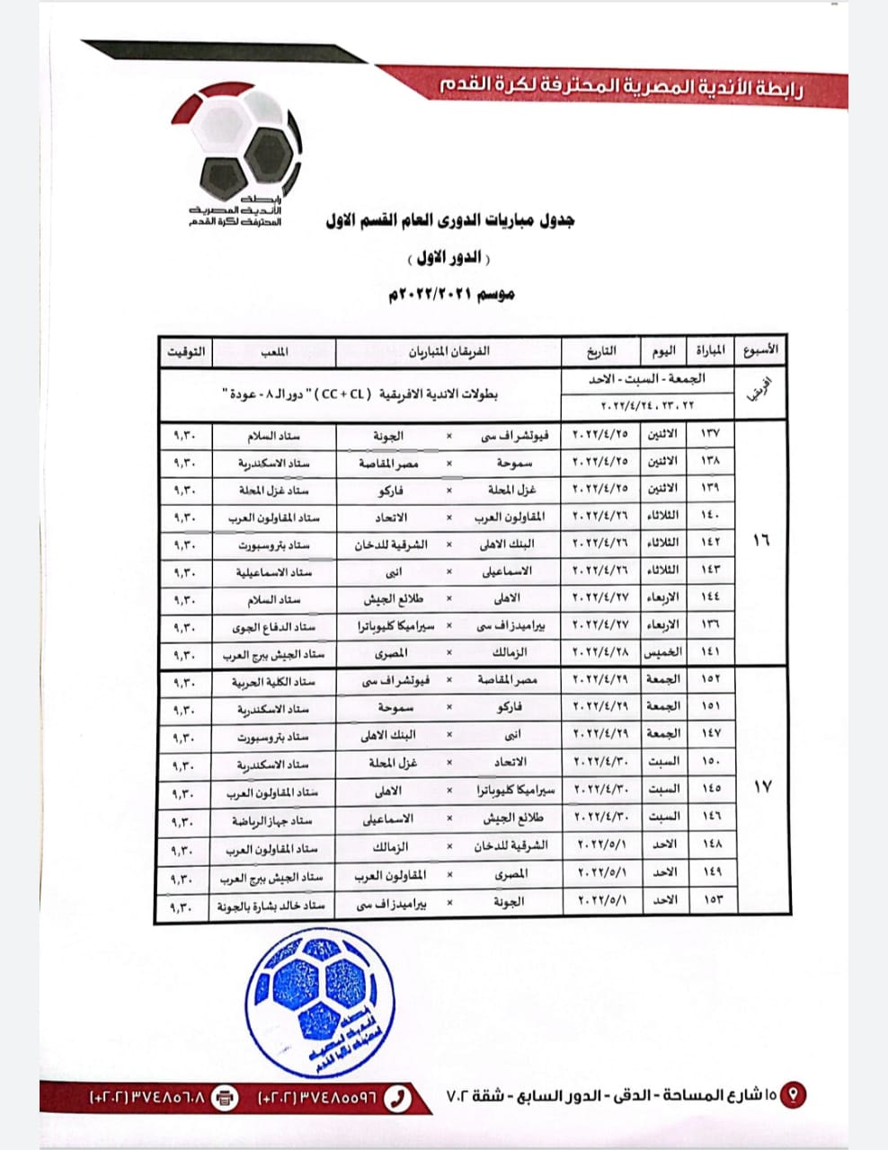 وفي حالة تأهل الأهلي في كأس العالم للأندية سيتم تأجيل مباراته في الجولة ذاتها لموعد يحدد لاحقًا، بينما تقام الجولة الـ17 مطلع شهر مايو المقبل.
