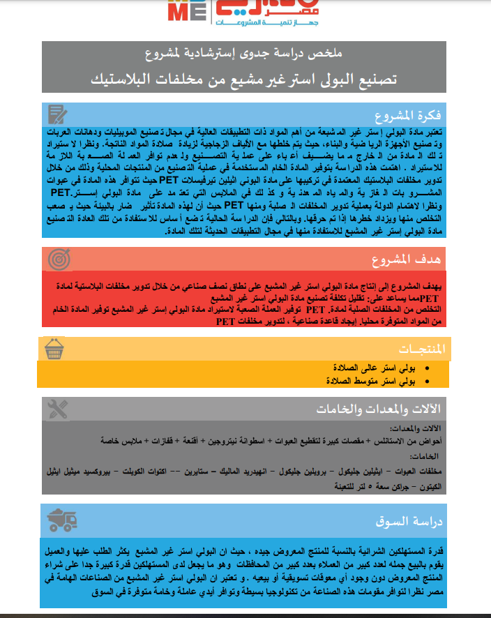 وتستعرض "فـيتو" خلال السطور التالية كافة التفاصيل المتعلقة بدراسة جدوى استرشادية لمشروع تصنيع البولي استر غير المشبع من مخلفات البلاستيك والتي أعدها جهاز تنمية المشروعات الصغيرة والمتوسطة.