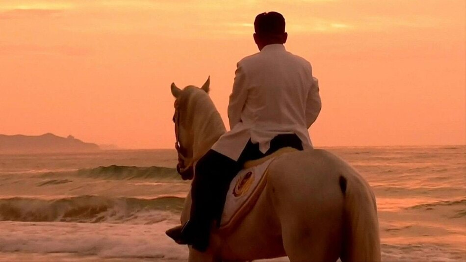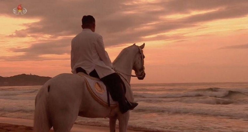 وينتهي الشريط المصور بمشاهد تظهر كيم ممتطيا حصانا أبيض، أحد رموز حكم سلالة عائلة كيم.