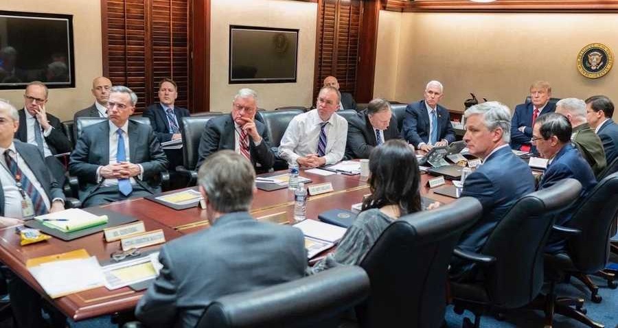 وظهرت آنذاك صورة مشابهة لترامب وهو يشاهد العملية العسكرية مع نائبه مايك بنس، ووزير الدفاع مارك إسبر، بالإضافة إلى قادة الأركان المشتركة وآخرين.