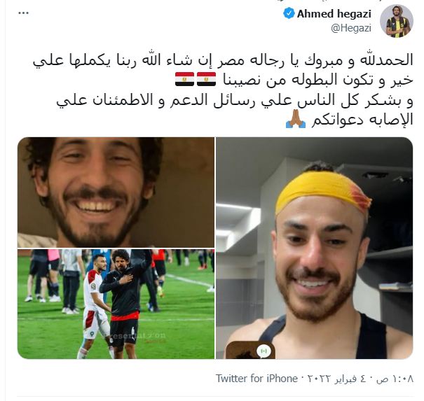 وقال عبر حسابه الرسمي بـ"تويتر": "الحمد لله ومبروك يا رجالة مصر إن شاء الله ربنا يكملها على خير وتكون البطولة من نصيبنا.. وبشكر كل الناس على رسائل الدعم والاطمئنان على الإصابة دعواتكم".