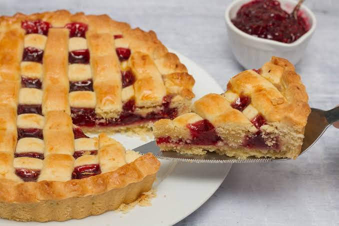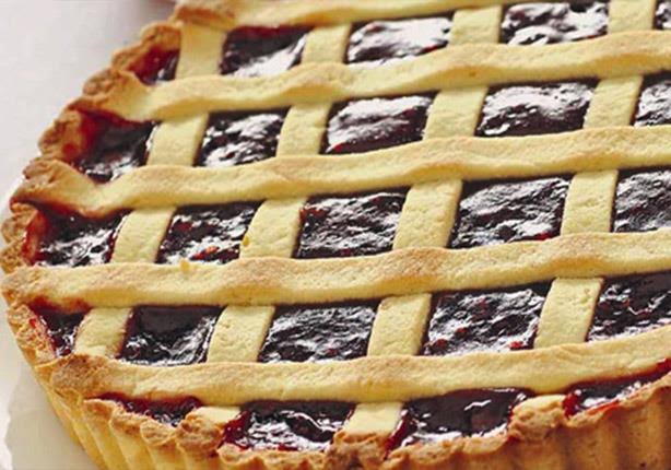 يحشى بالمربي، ثم يغطى بشرائط من العجين المتبقي.