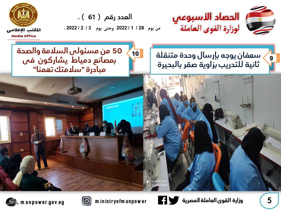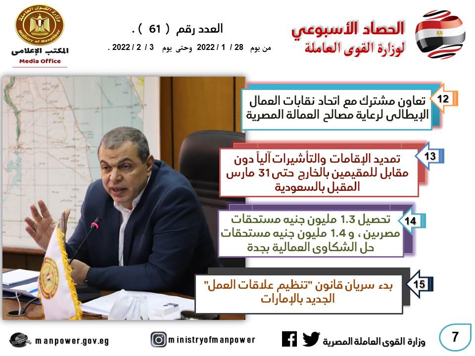 شهد حصاد الأسبوع الحالي، في وزارة القوى العاملة العديد من الأحداث المهمة خلال الفترة من 28 يناير الماضي إلى 3 فبراير الجاري- منها وزير القوي العاملة يسلم 150 وثيقة تأمين تكافلي للعمالة غير المنتظمة و15 عقد عمل لذوي القدرات لدمجهم في المجتمع والاستفادة من قدراتهم بشرم الشيخ، ويشهد ختام فعاليات ندوة مبادرة "سلامتك تهمنا " للحد من إصابات ومخاطر بيئة العمل، وتوفير 290 فرصة عمل برواتب مجزية فى محافظتي الوادي الجديد وبورسعيد، وتعيين 14 ألف 901 شاب منهم 186 " قادرون باختلاف" في 5 محافظات، وتحصيل 2.6 مليون جنيه مستحقات مصريين من حل الشكاوى العمالية بجدة بالسعودية .