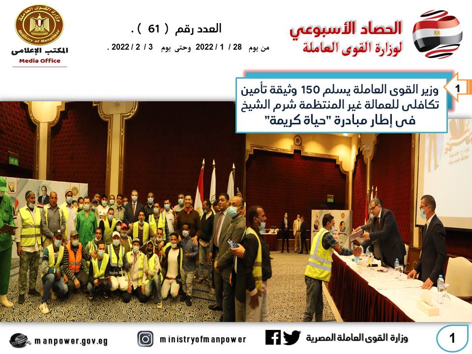 وفيما يلي تفاصيل ما جاء بالحصاد الأسبوعي، حيث استأنف وزير القوي العاملة محمد سعفان جولاته الميدانية للمحافظات، حيث زار محافظة جنوب سيناء، وقام الوزير بتسليم 150 وثيقة تأمين تكافلي ضد الحوادث الشخصية للعمالة غير المنتظمة المسجلة بمديرية القوي العاملة بشرم الشيخ، تغطي الوفاة، والعجز الكلى المستديم، والجزئي، وذلك بعد أن تم رفع قيمتها التأمينية إلي 200 ألف بعد أن كانت 100 ألف جنيه، مشيرا إلي أنه تم رفع المستهدف من 250 ألفًا إلي 500 ألف وثيقة على مستوى محافظات مصر لرعاية تلك الفئات المهمشة التى ظلت لفترة طويلة تعاني من ظروف الحياة، تحت مظلة المبادرة الرئاسية الواعدة "حياة كريمة"، بحضور أشرف علم الدين مدير المديرية، وسهير الليثي وكيل وزارة القوي العاملة للسلامة والصحة المهنية تأمين بيئة العمل، ومايكل فيزر مدير عام فندق دمينا كورال باي .