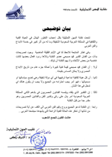 وقالت النقابة إنها تابعت بكل إعجاب، التطور الهائل في الحياة الفنية والثقافية في المملكة العربية السعودية الشقيقة، وما له من أثر كبير في خدمة الإبداع والفن العربي.