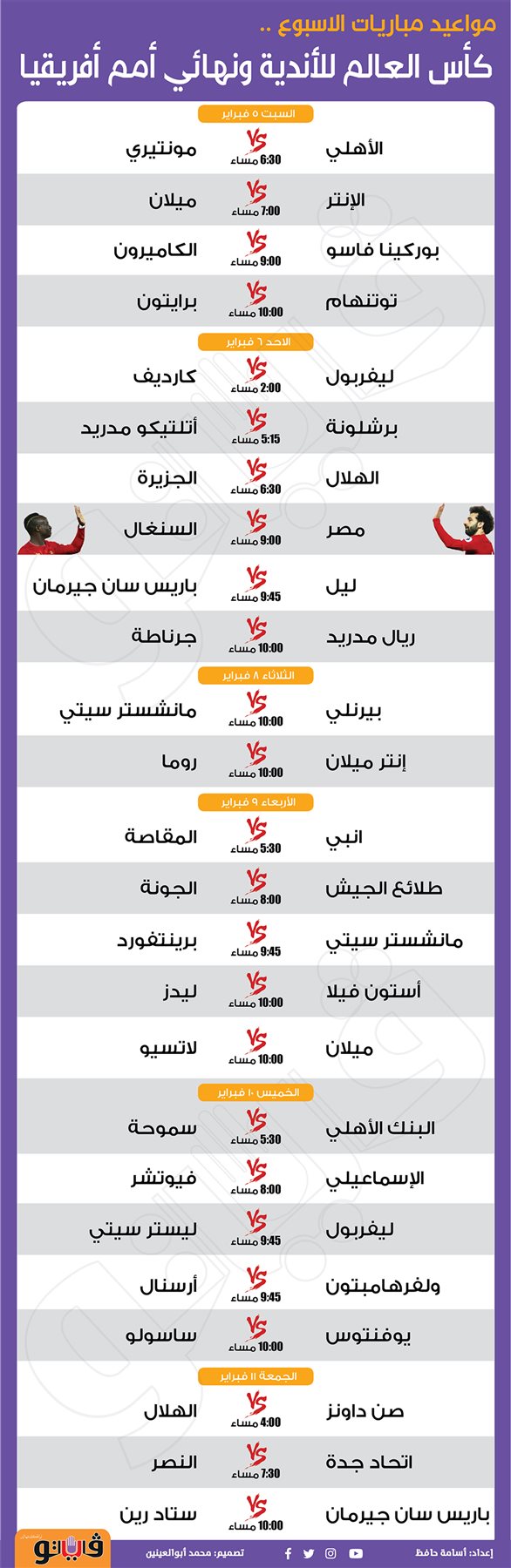 كأس العالم للأندية ونهائي أمم أفريقيا.. مواعيد مباريات الاسبوع|انفوجراف الجمعة 04/فبراير/2022 - 06:59 م 2/4/2022 6:59:46 PM مباريات الأسبوع اسامة حافظ شارك طباعة 18 حجم الخط شارك طباعة مانشستر سيتي ليفربول باريس سان جيرمان كأس العالم للأندية نهائى أمم أفريقيا مواعيد مباريات الأسبوع