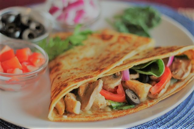 - ثم نضيف المودزاريلا، ونغلق العجين مثلث، ونضعه على مقلاة غير لاصقة ونرفعه على النار، ونتركه حتى يتحمر قليلا، ثم نقلبه على الوجه الآخر حتى يتحمر أيضا، ويقدم بعدها ساخنا بجانب البطاطس المقلية والمخلل.