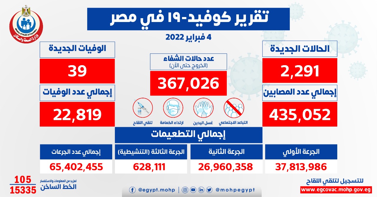 وأوضح الدكتور حسام عبد الغفار، المتحدث الرسمي لوزارة الصحة والسكان، أنه تم تسجيل 2291 حالة جديدة ثبتت إيجابية تحاليلها للفيروس ومتحوراته، وذلك ضمن إجراءات الترصد والتقصي والفحوصات اللازمة التي تُجريها الوزارة وفقًا لإرشادات منظمة الصحة العالمية، لافتًا إلى وفاة 39 حالة جديدة.