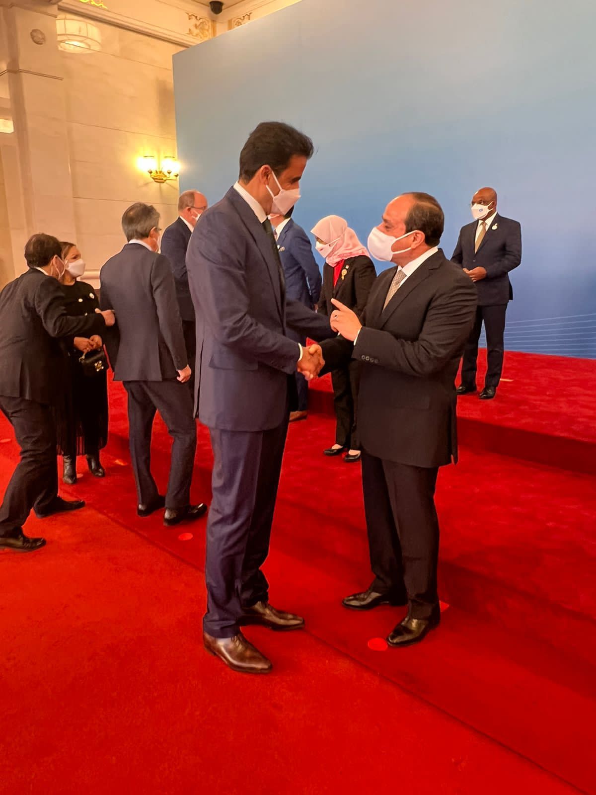 ترحيب حار بين الرئيس السيسي وأمير قطر ببكين | صور
