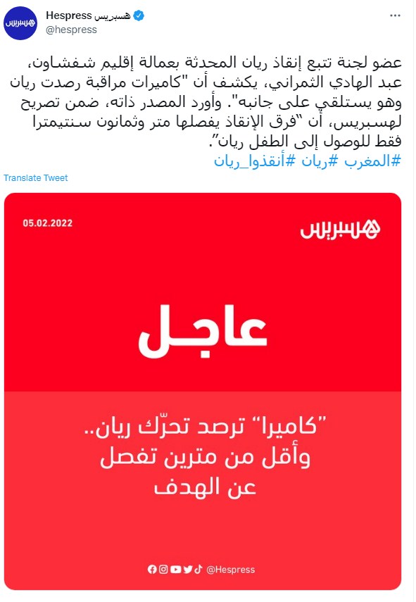 أكد موقع جريدة "هسبريس" المغربية، أن أحد كاميرات المتابعة المستخدمة في عملية إنقاذ الطفل ريان، ذو الخمس سنوات والعالق في البئر العميقة، رصدت حركة الطفل ريان وهو مستلقٍ على جانبه، مشيرًا إلى أن فرقة الإنقاذ تفصلها عن إنقاذ الطفل الصغير متر وثمانين سنتيميتر.