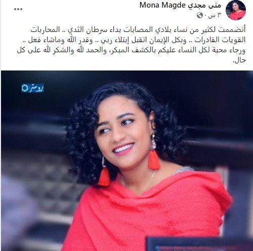 كشفت الفنانة السودانية، منى مجدي، إصابتها بسرطان الثدي.