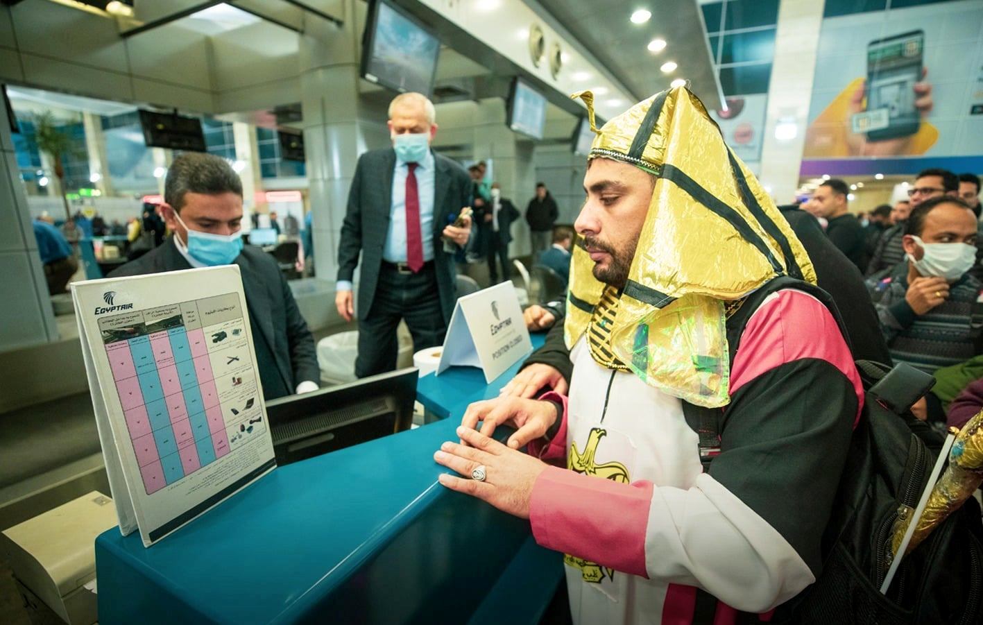 وتواجدت الجماهير المصرية في المطار منذ ساعات من أجل إنهاء إجراءات السفر إلى الكاميرون، لدعم المنتخب الوطني في نهائي البطولة القارية.