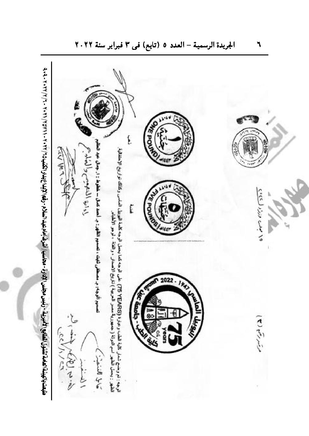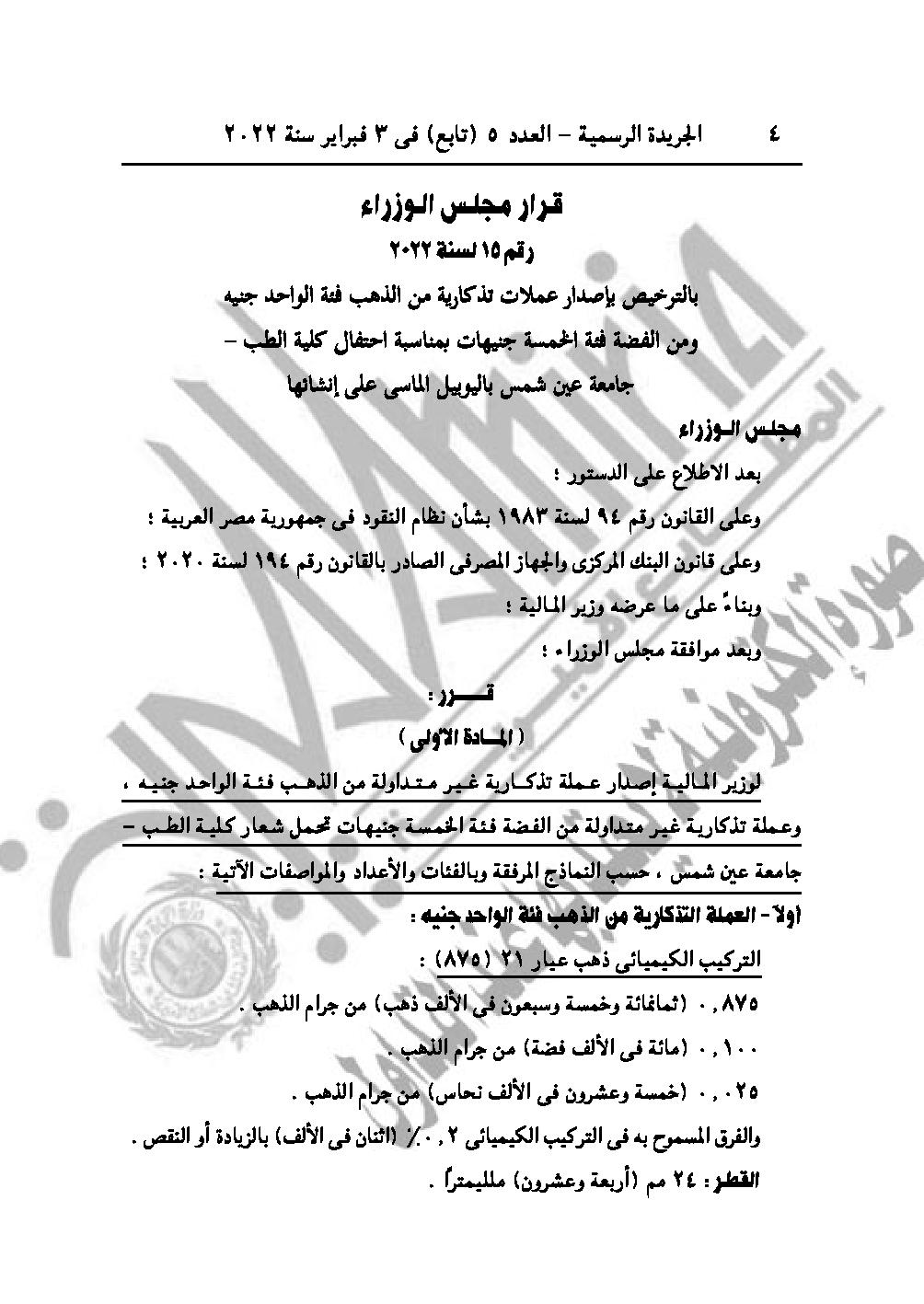 نشرت الجريدة الرسمية في عددها رقم 5 (تابع)، الصادر في 3 فبراير 2022، قرار رئيس الوزراء الدكتور مصطفى مدبولي رقم 15 لسنة 2022، بالترخيص بإصدار عملات تذكارية من الذهب فئة الواحد جنيه ومن الفضة فئة الخمسة جنيهان بمناسبة احتفال كلية الطب، جامعة عين شمس باليوبيل الماسي على إنشائها.