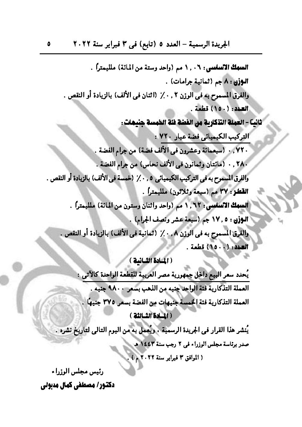 ثانيًا: العملة التذكارية من الفضة فئة الخمسة جنيهات، والتركيب الكيميائي فضة عيار 720، بقطر 37 ملليمترًا،بوزرن 17.5 جرام، ويتم ًادصدار 150 قطعة منها.