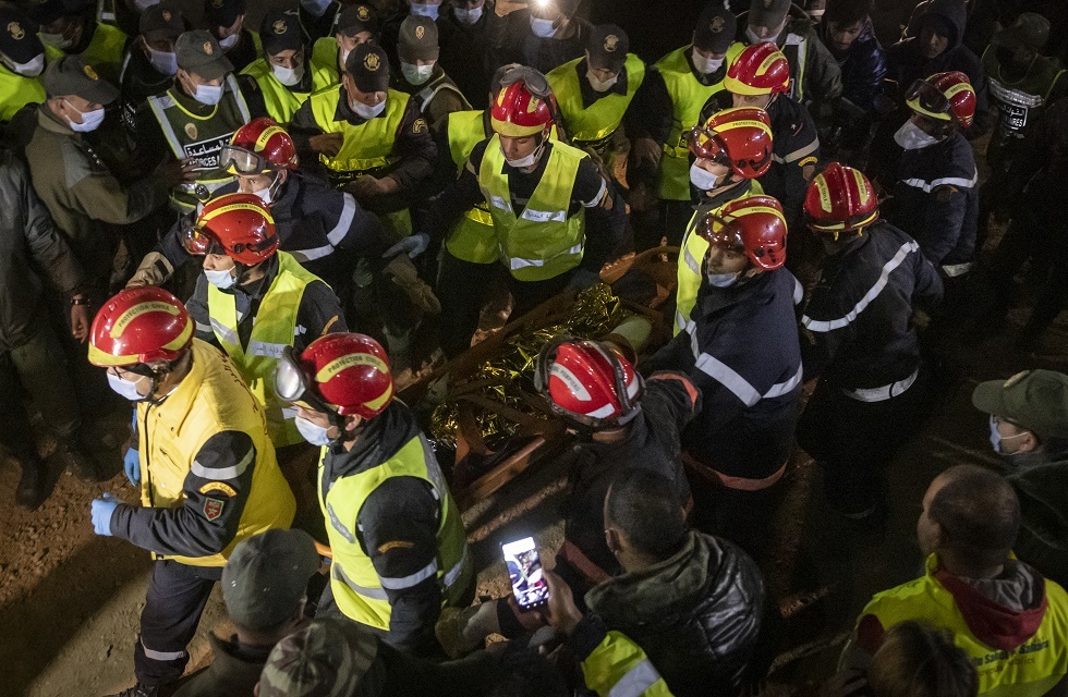 وتظهر في الصور فرق الإنقاذ بالمغرب، وهي تحمل جثمان الطفل ريان، بعد نجاحها في انتشاله من البئر، قبل أن يعلن في وقت لاحق خبر وفاته.
