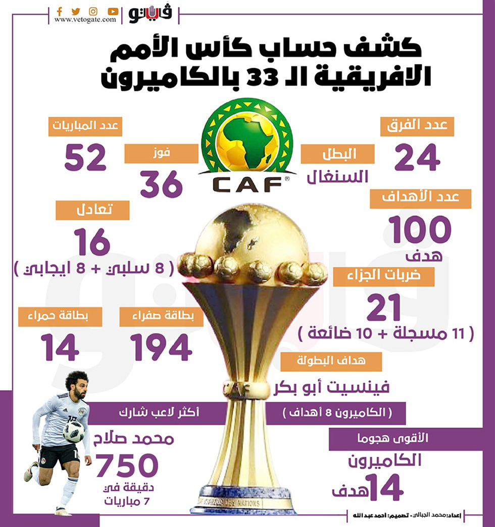 كشف حساب كأس الأمم الأفريقية الـ33 بالكاميرون | إنفوجراف الإثنين 07/فبراير/2022 - 02:30 ص 2/7/2022 2:30:49 AM من مباراة مصر والسنغال إعداد محمد الجبالي شارك طباعة 18 حجم الخط شارك طباعة محمد صلاح كاس الأمم الإفريقية الكاميرون كشف حساب ضربة جزاء