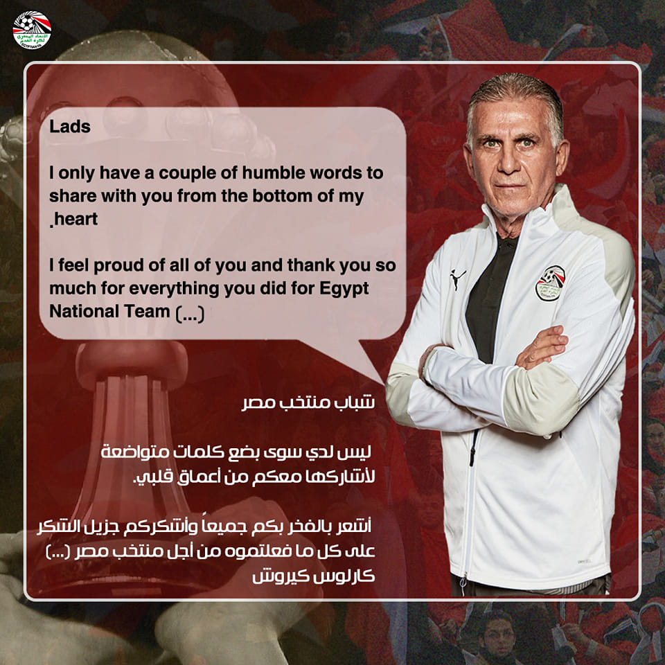 ونشر الموقع الرسمي لاتحاد الكرة رسالة خاصة من كيروش: شباب منتخب مصر ليس لدي سوي بعض كلمات متواضعة لأشاركها معكم من أعماق قلبي أشعر بالفخر بكم جميعا وأشكركم جزيل الشكر على كل ما فعلمتوه من أجل منتخب مصر.
